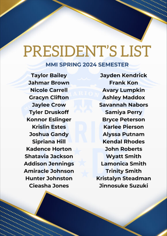 MMI is proud to announce those cadets who earned a spot on the President's List (4.0 GPA) or Dean's List (3.5+ GPA) for the Spring 2024 semester.